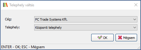 A menüpont segítségével a felhasználó egy másik telephelyre és cégre válthat anélkül, hogy ehhez újból ki és be kellene jelentkeznie. A menüpontra kattintva a telephelyek és cégek közül választhat egy új ablakban. Válassza ki a listából a kívánt telephelyet és céget, majd kattintson az OK gombra! Ezután a program automatikusan telephelyet és céget vált!