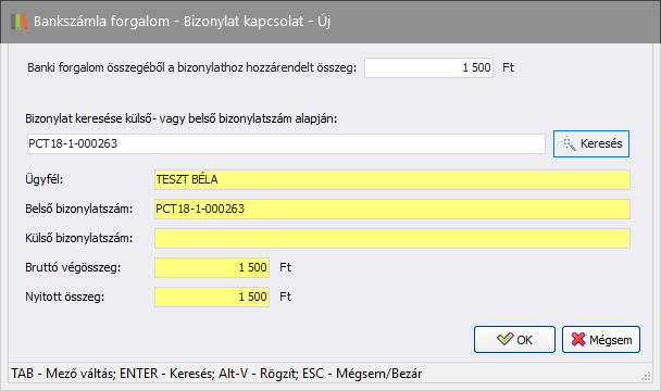 Adhat meg kapcsolódó bizonylatot a bankszámla forgalomhoz. Ehhez szükséges tudnia a kapcsolandó bizonylat számát.