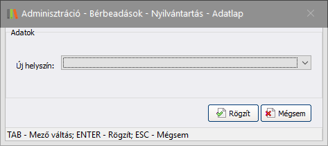 Átszállítás: ezzel a funkcióval egy helyszínre kiszállított eszközt tud átszállítani másik helyszínre. A funkció működésének feltétele, hogy egy bérbeadásnál legyen egy helyszínre rögzített eszköz kiszállítás, valamint legyen legalább egy másik helyszín rögzítve. Az alábbi ablakban tudja elvégezni az átszállítást: