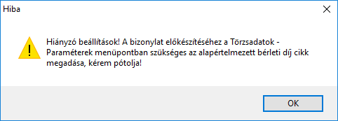 Fontos! Amennyiben a globális paraméterekben nincs beállítva az alapértelmezett bérleti díj cikk, akkor a rendszer egy figyelmeztető ablakot jelenít meg!