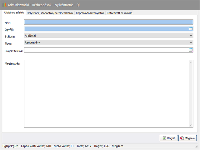 - Adja meg a bérbeadáshoz tartozó nevet. Ide olyan értéket célszerű megadni, amiből a lista nézetben könnyen beazonosíthatja a bérbeadás tárgyát, tartalmát, helyszínét.