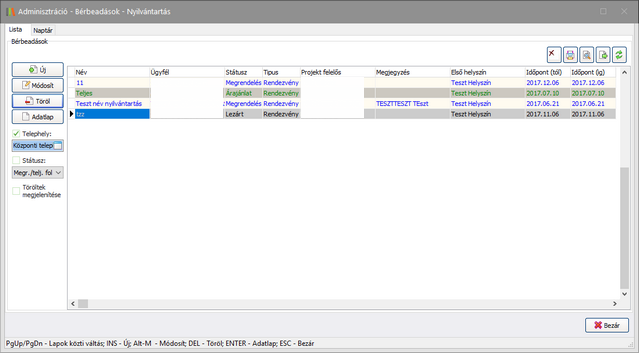 Elérése: Adminisztráció -> Bérbeadások -> Bérbeadások nyilvántartása