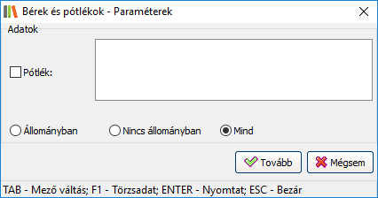 Pótlék: Kiválasztása esetén a mező kötelezően kitöltendő! A szomszédos mezőben ekkor kapcsolók segítségével adhatja meg, hogy melyik pótlékot/pótlékokat listázza a rendszer. A lista elemei a HR modulban rögzített pótlékok. (Alapértelmezetten a lista üres.)