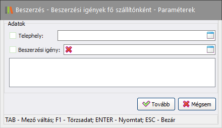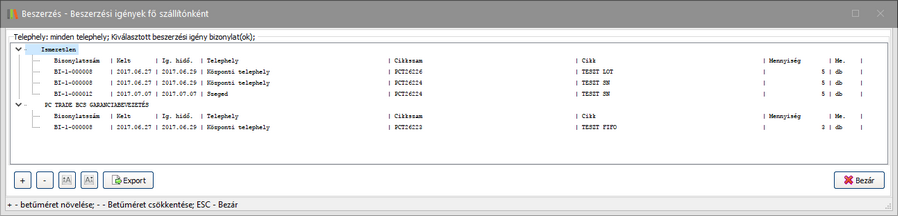 A lekérdezés eredményeképpen kapott listában látjuk a kiválasztott telephelyre vonatkozó beszerzési igényeket szállítónként csoportosítva.