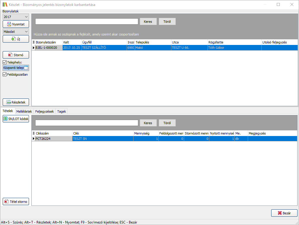 A bizományos jelentés bizonylatok karbantartó ablakának felépítése megegyezik a többi bizonylat karbantartó ablakával, melyről bővebben a Bizonylatok karbantartása c. fejezetben olvashat.