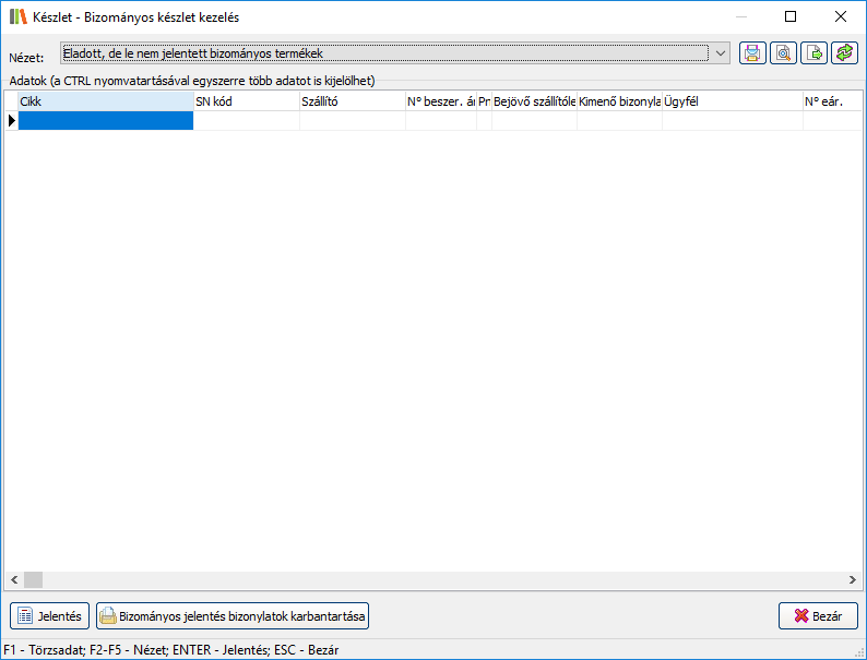 A bizományos készlet kezelésére/áttekintésére az alábbi ablak nyújt lehetőséget. Az ablakban öt féle nézet közül választhat: