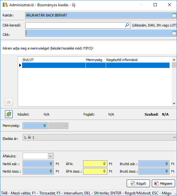 mezőből válassza ki a használni kívánt raktárat. - A Cikk:
