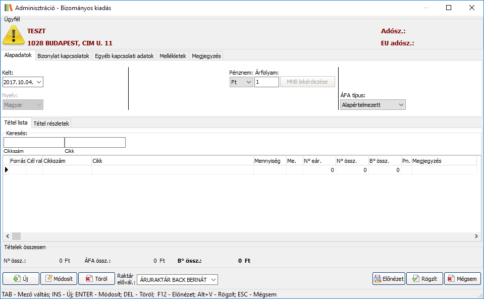 - Ha megadott minden szükséges adatot a fenti fülek segítségével, következhet a tételek hozzáadása a bizonylathoz.