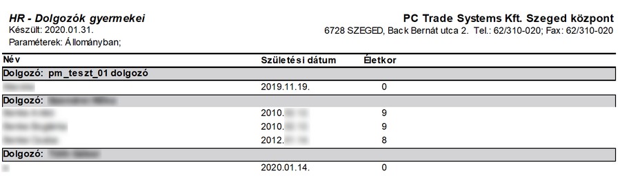 A dolgozók gyermekeinek listája, születési dátummal és életkorral.