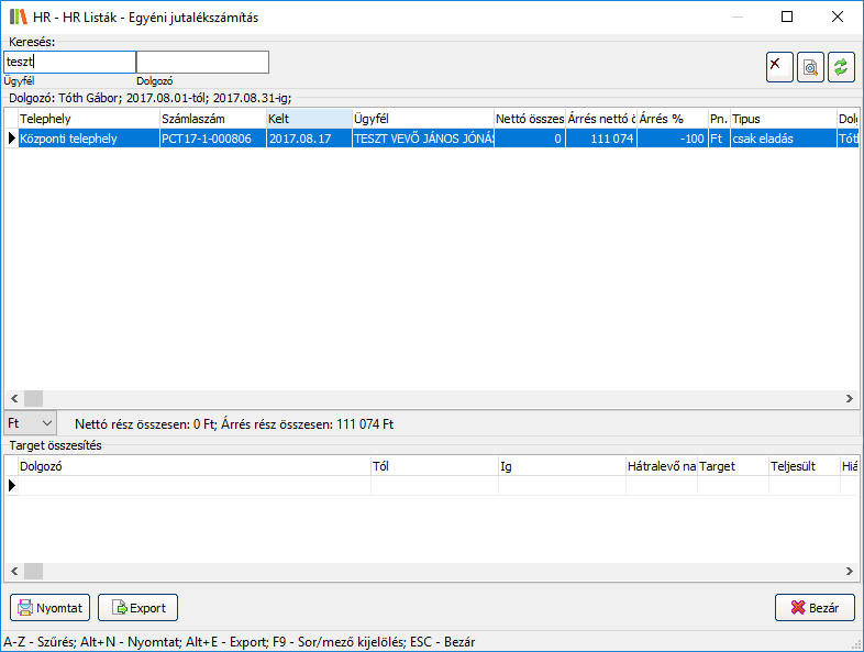 A kimutatás ablak felső felében a bizonylatokat láthatja, az alsó részben pedig a rögzített targeteket. A felső ikonsávon elérhető a