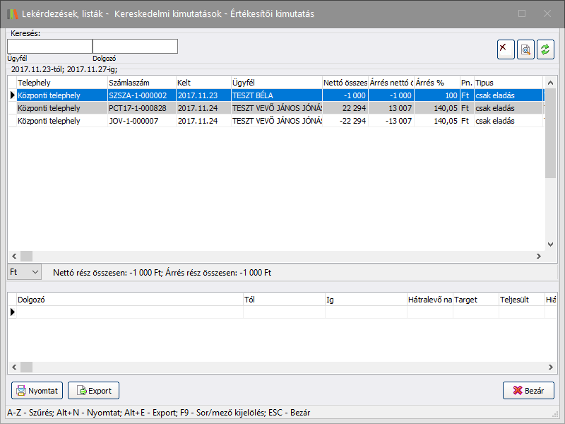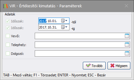 A megadott dátum intervallum között keltezett bizonylatok esetén vizsgálja az adott értékesítő munkáját. Alapértelmezett értéke az előző hónap első és utolsó napja.