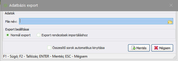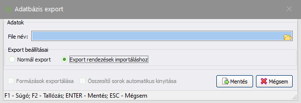 Az itt található export funkció az "Export rendezések importálásához" opcióban különbözik az általános exportálástól. Amennyiben a "Normál export" opció kerül kiválasztásra, úgy az általános funkcionalitás érhető el. Az "Export rendezések importálásához" opcióval a "Vevői követelések, szállítói tartozások rendezése" ablak szűrési feltételeinek megfelelő bizonylatainak adatait lehet CSV fájlként menteni.