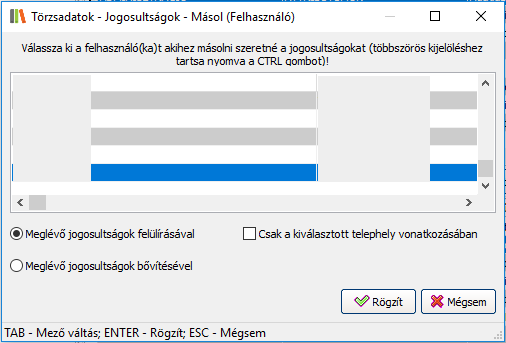 Felhasználó adott telephelyre beállított jogosultságainak másolása másik telephelyre: A megfelelő felhasználó és másolandó (forrás) telephely kiválasztása után kattintson a