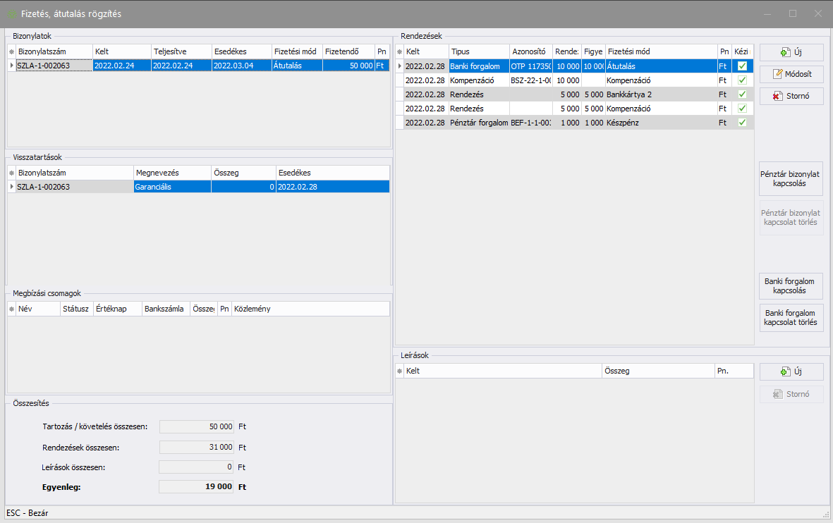 Ez a funkció a Számlához tartozó befizetések, átutalások és leírások rögzítésére, karbantartására ad lehetőséget. A Fizetés, átutalás rögzítés ablak Visszatartások részében kerülnek megjelenítésre a Számlához rögzített esetleges visszatartások. A Fizetés, átutalás rögzítés ablak Megbízási csomagok részében az esetleges megbízási csomaghoz rendelés jelenik meg. A készpénzes Fizetési módú Számlák már rögzítésükkor kiegyenlítettek, kifizetettek, ám a halasztott Fizetési módú Számláknak ideális esetben a rájuk rögzített Fizetési határidőig kell kiegyenlítődniük. Ezen halasztott Fizetési módú Számlák kiegyenlítése rögzíthető és tartható karban ezzel a funkcióval. A kiegyenlítések történhetnek rendezésekkel vagy leírásokkal. A rendezések tényleges fizetéseket jelentenek, olyanokat, amelyek megjelennek a pénzügyi bevételek között. A leírások olyan összegek, melyek nem kerülnek be a pénzügyi bevételek közé, de az Ügyfél felé történő Követelést csökkentik.