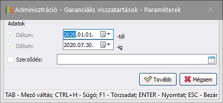 Ezzel a lekérdezéssel adott időszakra lehet akár az összes szerződés, akár egy kiválasztott szerződés vonatkozásában lekérdezni a lejáró visszatartásokat.