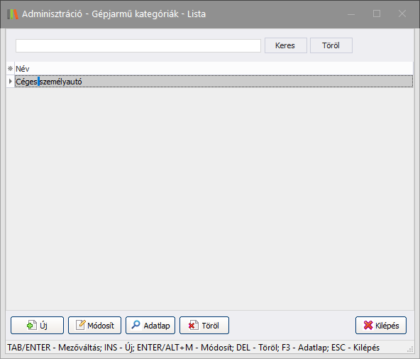 Elérése: Adminisztráció -> Gépjármű -> Gépjárműkategóriák törzs