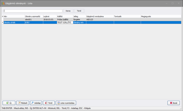 Elérése: Adminisztráció -> Gépjármű -> Gépjármű okmányok