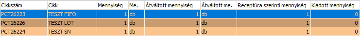A listában cikkenként látható a jelenleg megadott, a receptúra szerinti, illetve a már kiadott anyag mennyiség.