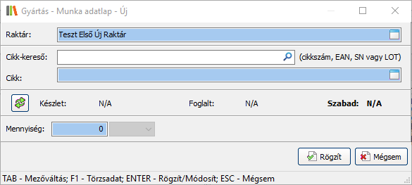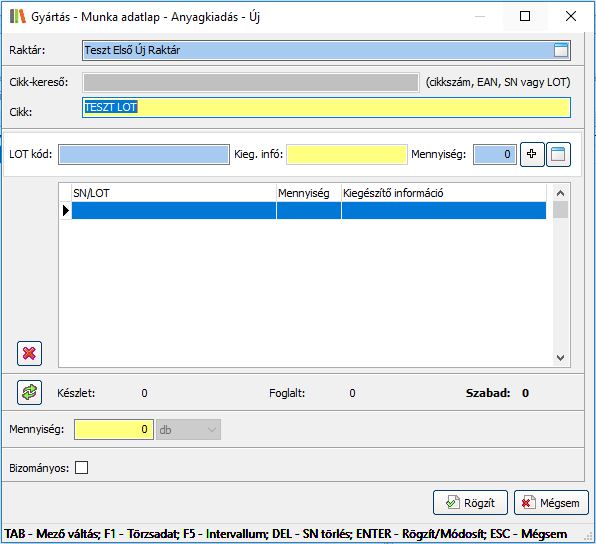 Fontos! A raktárról kiadott anyagok kivezetése az anyagkiadással még nem történik meg, csak foglalásba kerül a kiadott anyag mennyiség, így azzal további munkavégzés nem lehetséges. A tényleges anyagkiadás a gyártás zárásakor történik meg.