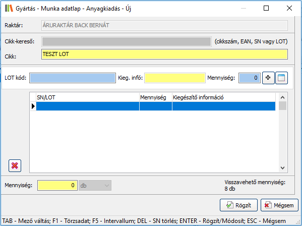 Az SN/LOT kódos anyagoknál a kód melletti mezőben megadhatja a visszavételezni kívánt mennyiséget.