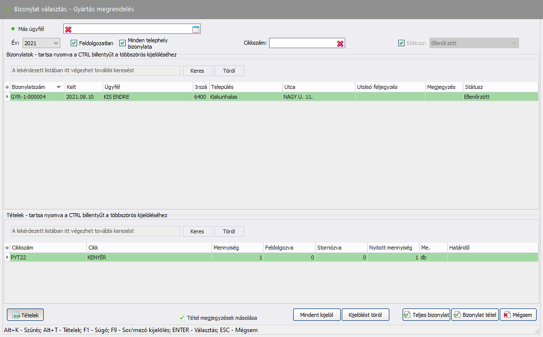 (Teljes bizonylat) gombra! - Ha a bizonylatból csak egy kiválasztott tételt kíván legyártani, akkor:
