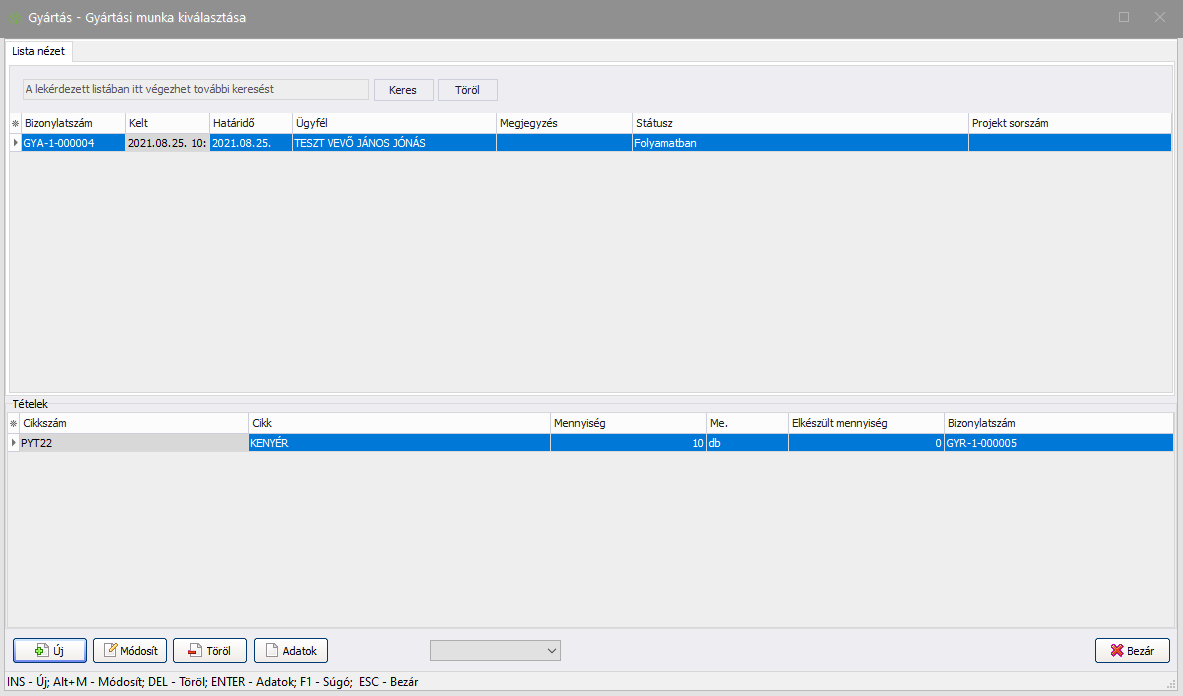 (Módosít): A gyártáshoz tatozó munka adatlap megnyitása szerkesztésre.