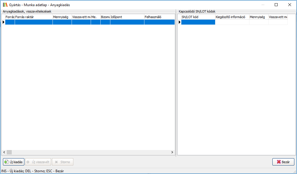 (Új kiadás): A kiválasztott tételhez új anyagkiadás rögzítése.