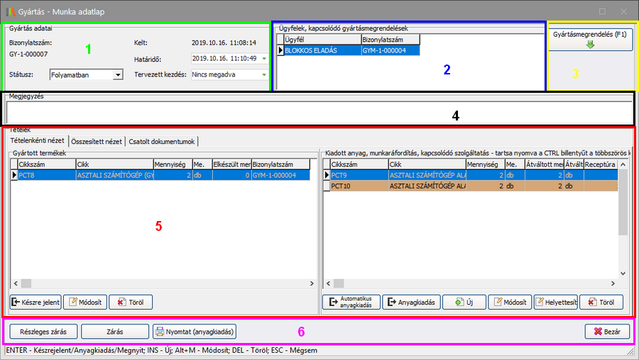 - 5. A gyártandó termékek és a szükséges anyagokkal kapcsolatos információk és funkciók: Itt adminisztrálhatja többek között az anyagkiadást és a legyártott termékek készrejelentését, valamint dokumentumokat csatolhat az adatlaphoz. (Bővebben a Tételenkénti nézet, az Összesített nézet és a Csatolt dokumentumok c. fejezetekben.)