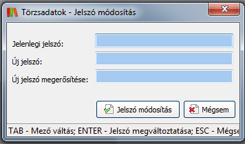 Ebben a menüpontban a felhasználó módosíthatja saját belépési jelszavát, ehhez természetesen először meg kell adni az aktuálisan érvényes jelszót is, hogy a felhasználót a rendszer azonosíthassa. Csak az aktuálisan bejelentkezett felhasználó jelszavát lehet ilyen módon módosítani, következő bejelentkezés már csak az új jelszó megadásával lehetséges.