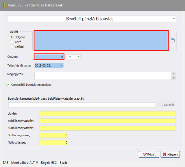 Fontos! Amennyiben a be- és kifizetéshez megad kapcsolódó bizonylatot, akkor a rendszer rögzítéskor automatikusan a pénzügyi rendezést is elkészíti a teljesítés dátumára. Ha a választott kapcsolódó bizonylat és a készülő pénztár bizonylat pénzneme nem egyezik, úgy a pénzügyi rendezések mintájára a felhasználónak meg kell adnia a rendezett összeget is.