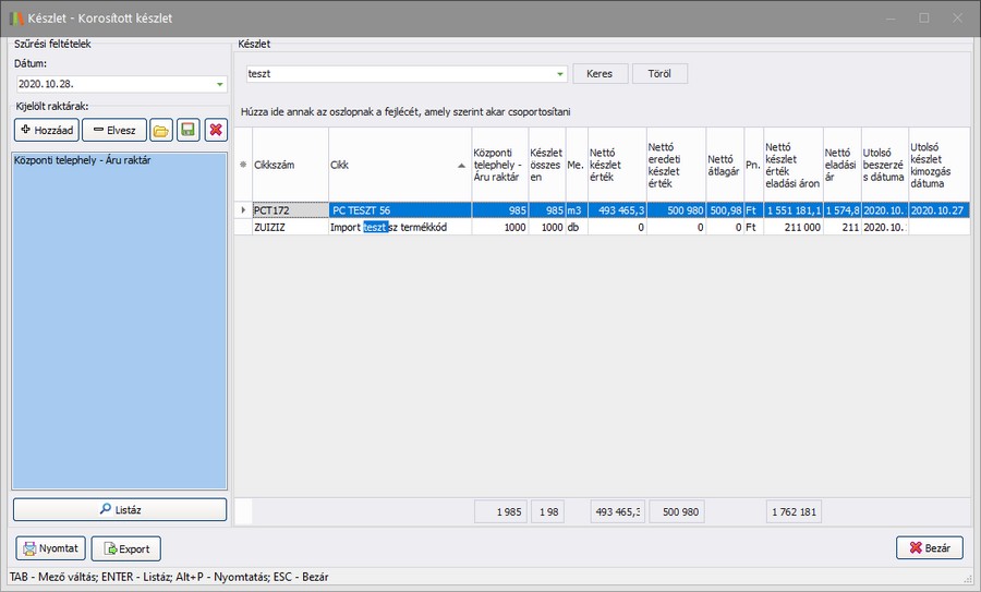 (Elvesz) gombokkal tudja a raktárakat kijelölni, mely raktárak esetében mutassa az adott dátumra vonatkozó készlet adatokat.