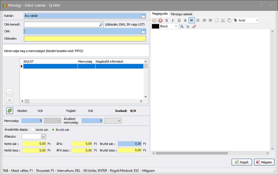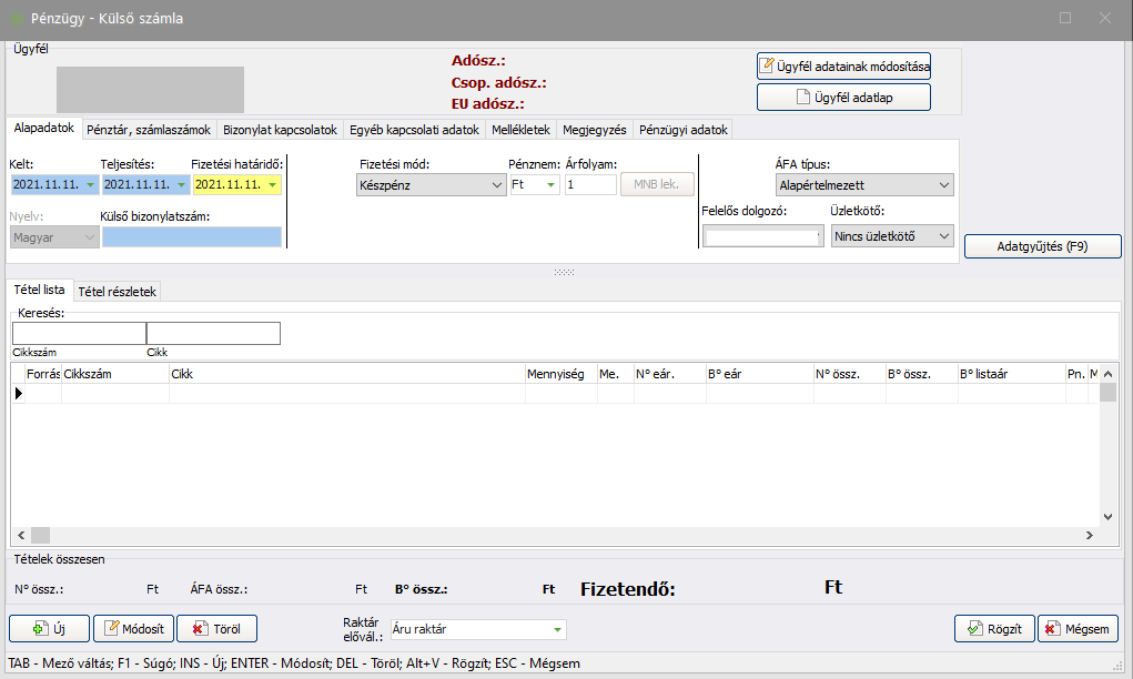 - Ha megadott minden szükséges adatot a fenti fülek segítségével, következhet a tételek hozzáadása a bizonylathoz.