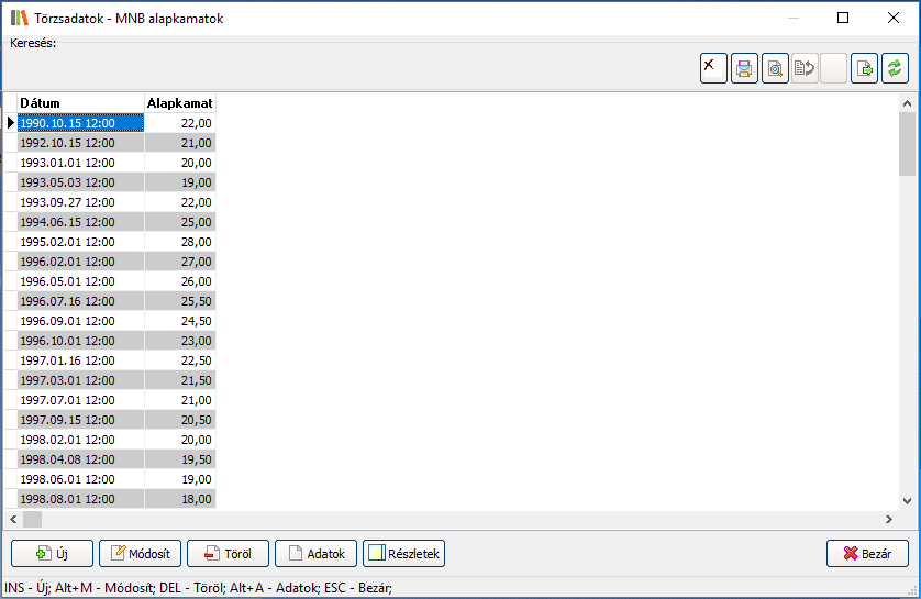MNB alapkamatának változásait tárolja a rendszer. Ezek az adatok az esetleges késedelmi kamatok kiszámolásához használhatók. A változások a megadott dátumtól a következő bejegyzés dátumáig érvényesek. Mindig a legfrissebb bejegyzés érvényes, míg a következő változást fel nem vezeti.