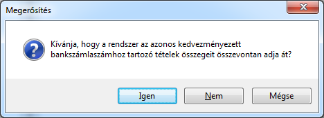 - Ha azt szeretné, hogy az egy számlaszámhoz tartozó tételeket a program összevonja egy tranzakcióba, akkor kattintson az Igen gombra. Ha fontos, hogy minden tétel külön tranzakcióként induljon, akkor kattintson a Nem gombra. Ha mégsem kívánja elküldeni a megbízási csomagot kattintson a Mégse gombra!