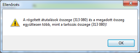 Fontos! A program figyeli, hogy a rögzített átutalások ne haladják meg a tartozás összegét! Ha az adott tételt vagy annak egy részét átutalásként már hozzárendelte egy megbízási csomaghoz, és újra megpróbálja megbízási csomaghoz rendelni, akkor a program a következő figyelmeztetést adja, (Mindig az aktuális összegekkel.) és nem rendeli a tételt a megbízási csomaghoz!