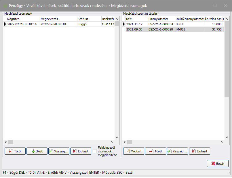 (Elutasít) gomb eltűnik, így a felhasználó ezek után nem módosíthatja közvetlenül a csomagok státuszát. A bankszámlaforgalom importja során nyert adatok alapján, a rendszer rögzíti a forgalmat és kezeli a csomagok státuszát. Miután a csomagban szereplő összes tétel banki adatai importálásra kerülnek, a rendszer a megbízási csomag státuszát feldolgozottra állítja.