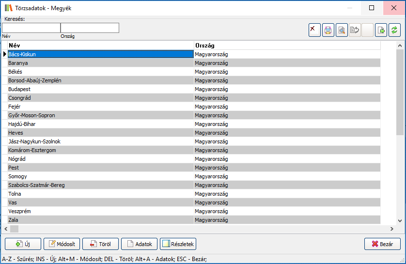 Elérése: Törzsadatok -> Egyéb -> Megyék