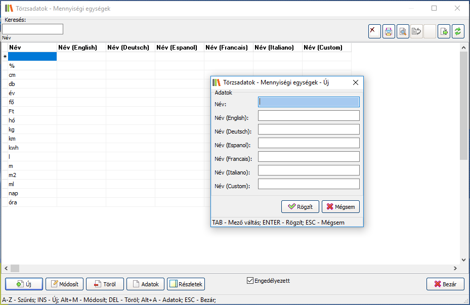 A listában egymás alatt helyezkednek el a mennyiségi egységek, mértékegységek. Amennyiben csak magyar nyelvű mértékegységeket szeretne használni, úgy elegendő megadni a Név: