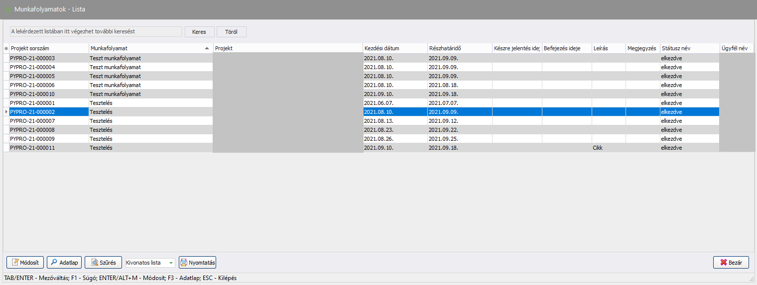 A lista alapértelmezésben a nem lezárt projektekhez tartozó, nyitott munkafolyamatokat jeleníti meg, de a feltételek a Szűrés gomb segítségével módosíthatók.