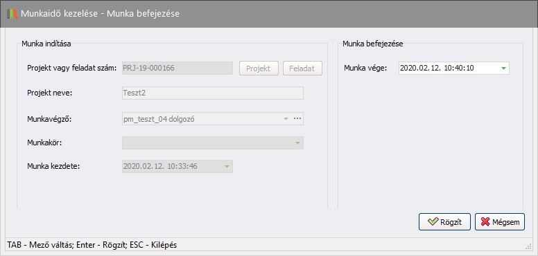 A Megállít gombbal a kijelölt munkaidőt lehet megállítani. Megállítás után a munkaidő a kiválasztott feladatra/projektre könyvelődik, annak adatlapján megtalálható a munkaidő rögzítés. A munka megállításánál csak a munka vége állítható be: