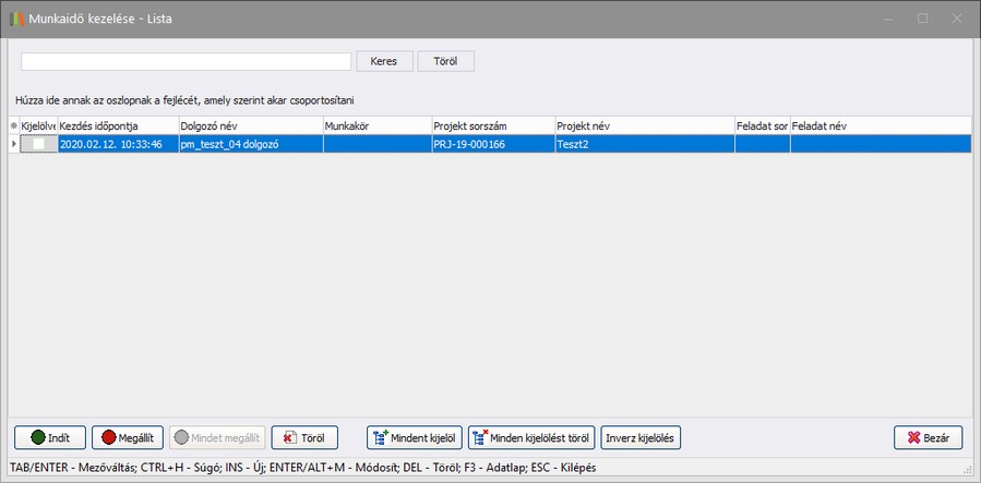 Az ablakban megjelenő lista tartalmazza a folyamatban lévő munkaidő rögzítéseket.