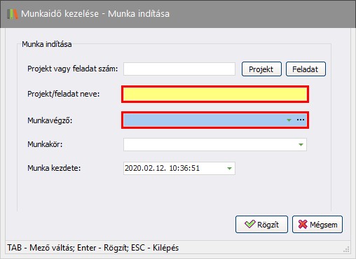 Új munkaidő indítható az Indít gombbal, ekkor az alábbi ablakban szükséges megadni/kiválasztani a projektet vagy feladatot, amire a munkaidőt fogja könyvelni a rendszer. Ki kell választani a munkavégzőt a dolgozók listájából. Megadható a munkakör, és beállítható a munka kezdete: