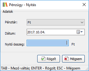Ezzel a funkcióval lehetséges a kiválasztott Pénztár nyitása. Minden Pénztárat egy napon belül többször meg lehet nyitni, de a legelső nyitáskor adható meg annak nyitódátuma és nyitóösszege. A későbbi nyitások alkalmával az egyenleg már nem módosítható. A zárások egyenlege lesz a következő nyitás nyitóegyenlege.