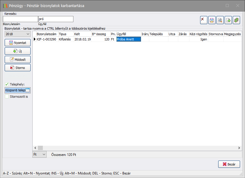 Fontos! Kizárólag olyan bizonylat sztornózható, amely nem más bizonylathoz kapcsolódik, és nem lezárt állapotú! Amennyiben a bizonylat egy Pénztár zárás funkcióval lezárt ciklusból származik, úgy nem sztornózható. Továbbá ha van a bizonylathoz kapcsolódó banki forgalmi adat (Pénztári feladás, Banki kivét), akkor az automatikusan törlődik.
