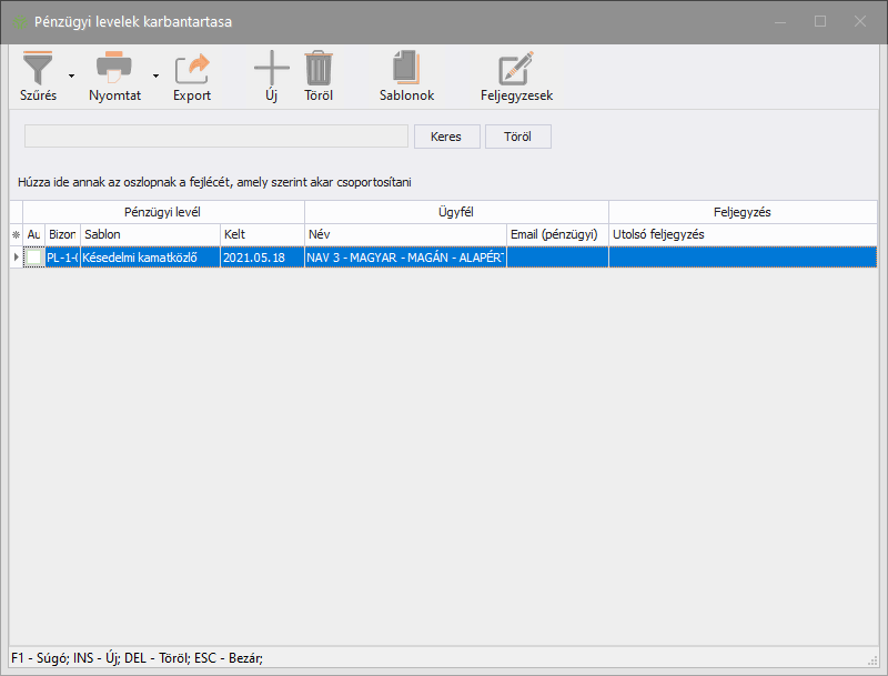 A funkció főképernyőjén a lista a már elkészült pénzügyi leveleket jeleníti meg függetlenül attól, hogy manuális vagy automatikus úton készültek (a lista első oszlopában ez az információ megjelenik). A lista kereshető, rendezhető, csoportosítható. Felhasználóként az alábbi lehetőség közül választhat: