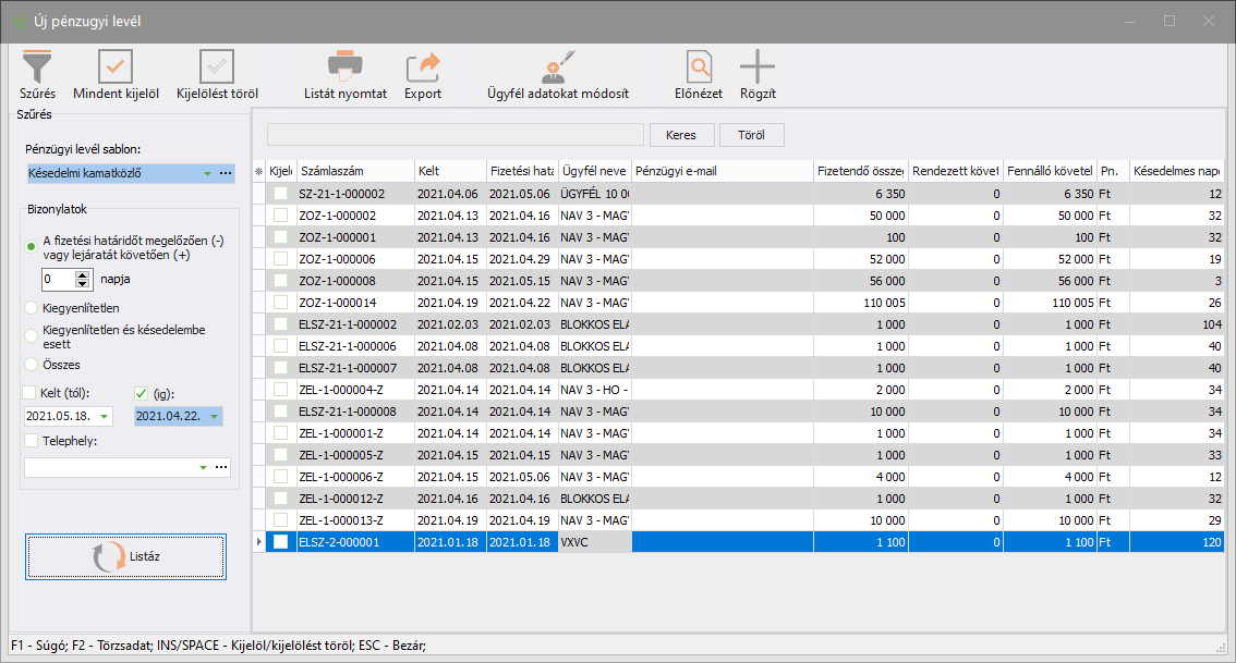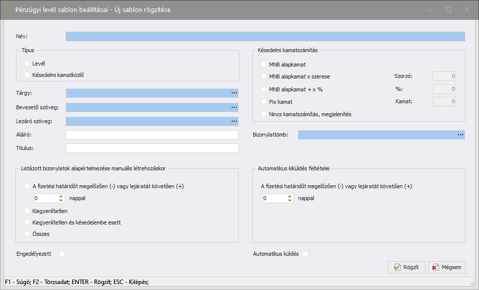- Típus: nyomtatási formátum, két választható opciója a levél és a késedelmi kamatközlő. Utóbbi választása esetén a késedelmi kamatszámításnál a "nincs kamatszámítás, megjelenítés" opció nem választható