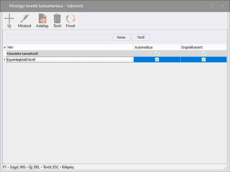 Sablonok: pénzügyi levél sablonok karbantartása, itt vehet fel új, vagy módosíthat meglévő sablont. Bővebben a Pénzügyi levél sablonok c. bekezdésben.