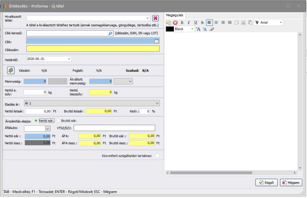 mezőbe a cikkhez tartozó megjegyzést. Ez a megjegyzés a nyomtatott proformán közvetlenül az adott tétel alatt jelenik meg. - Ha szeretné rögzíteni a tételt, kattintson a