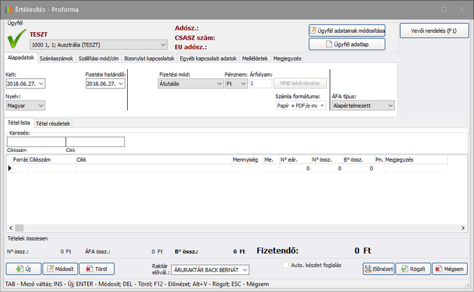 Új proforma rögzítéséhez válassza az Értékesítés -> Proforma menüpontot!