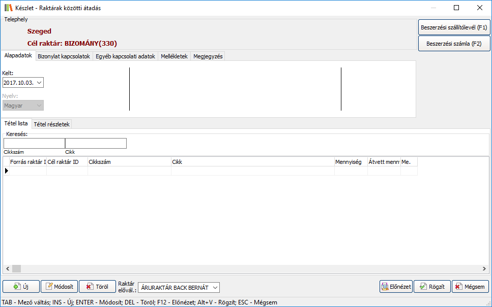 Ebben az ablakban van lehetősége a Raktárak közötti átadás típusú szállítólevelek karbantartására.